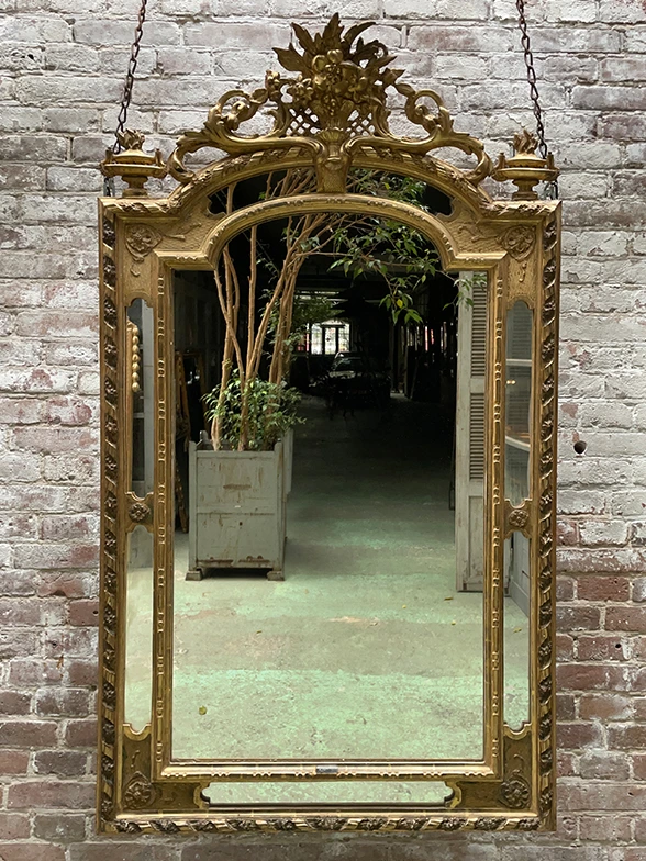Zoals gezegd is elke spiegel uit de 18e eeuw een reflectie van een tijdsbeeld, veelal beïnvloed door de stijl van de heersende vorst. Waar de 18e eeuwse spiegellijsten hand gestoken zijn, is de 19e eeuwse “pâte-tegenhanger” minder bewerkelijk maar nog steeds een waar stuk vakmanschap. De profilering van de lijst is van hout. De ornamenten en kuif zijn nu gemaakt van pâte met een basis van ijzer. De eeuwenoude techniek van vergulding is ook hier gebruikt.